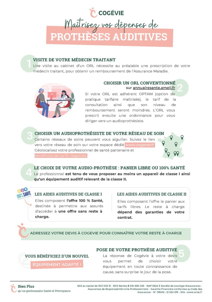 Voici une infographie à télécharger et à partager avec vos entreprises clientes. Elle résume en seulement 4 étapes comment maîtriser le coût de ses dépenses en équipements auditifs notamment grâce au 100% Santé.